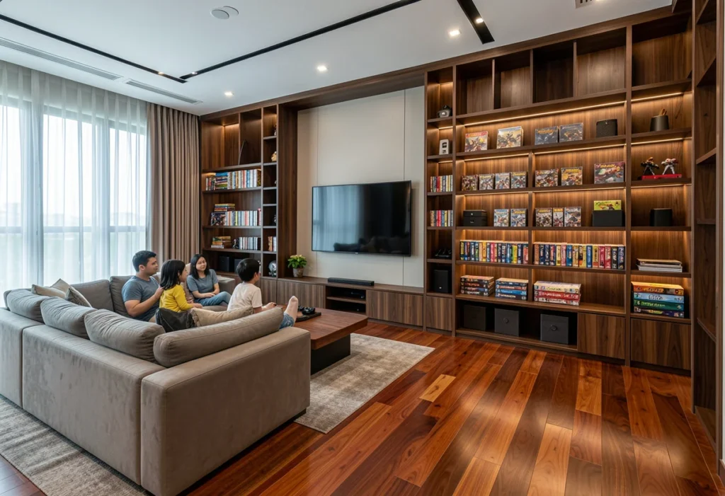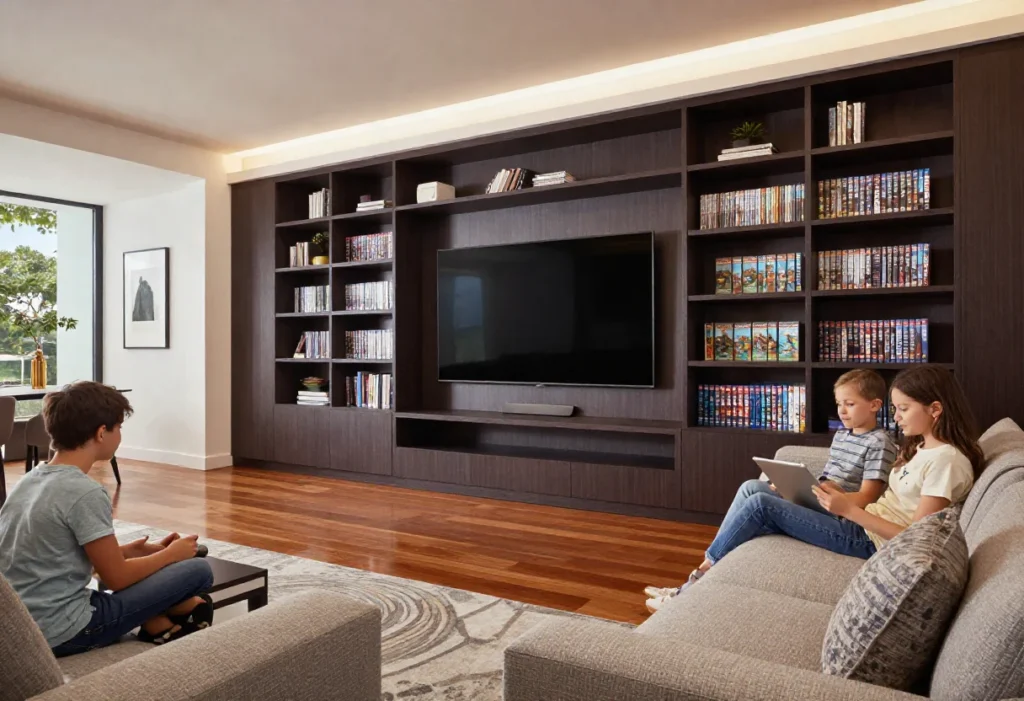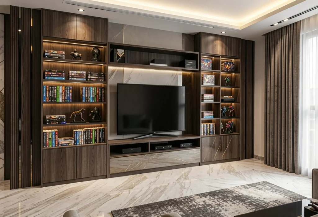 Custom designs offer storage solutions that match the homeowner’s lifestyle and technology requirements. Pull-out drawers provide easy access to gaming consoles, controllers, or media devices, while concealed cabinets hide equipment, cables, and accessories. Each element is designed for convenience and usability, keeping the entertainment area functional and clutter-free.